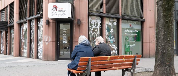 An einem Ort, an dem sich Menschen mit und ohne Beeinträchtigung auf Augenhöhe begegnen, inmitten des Frankfurter Bahnhofsviertels, wo das Leben pulsiert, täglich neue Perspektiven entstehen und gelebt werden – dort eröffnen wir einen Kunstraum auf Zeit. Mit dem Titel „Auf Augenhöhe – Kunst und Begegnungen“ laden wir zum Besuch von Ausstellungen und Veranstaltungen zum Mitmachen ein.
